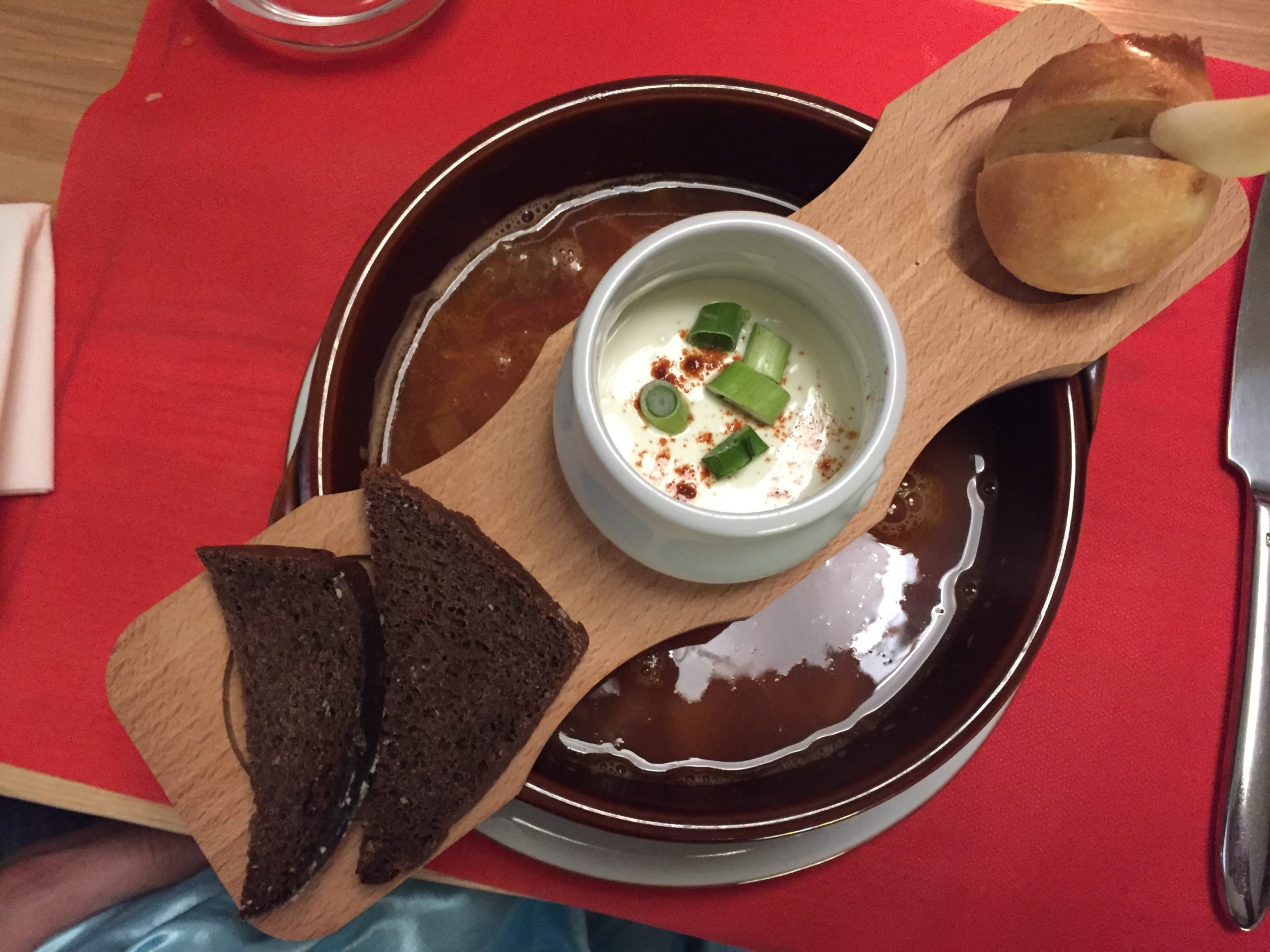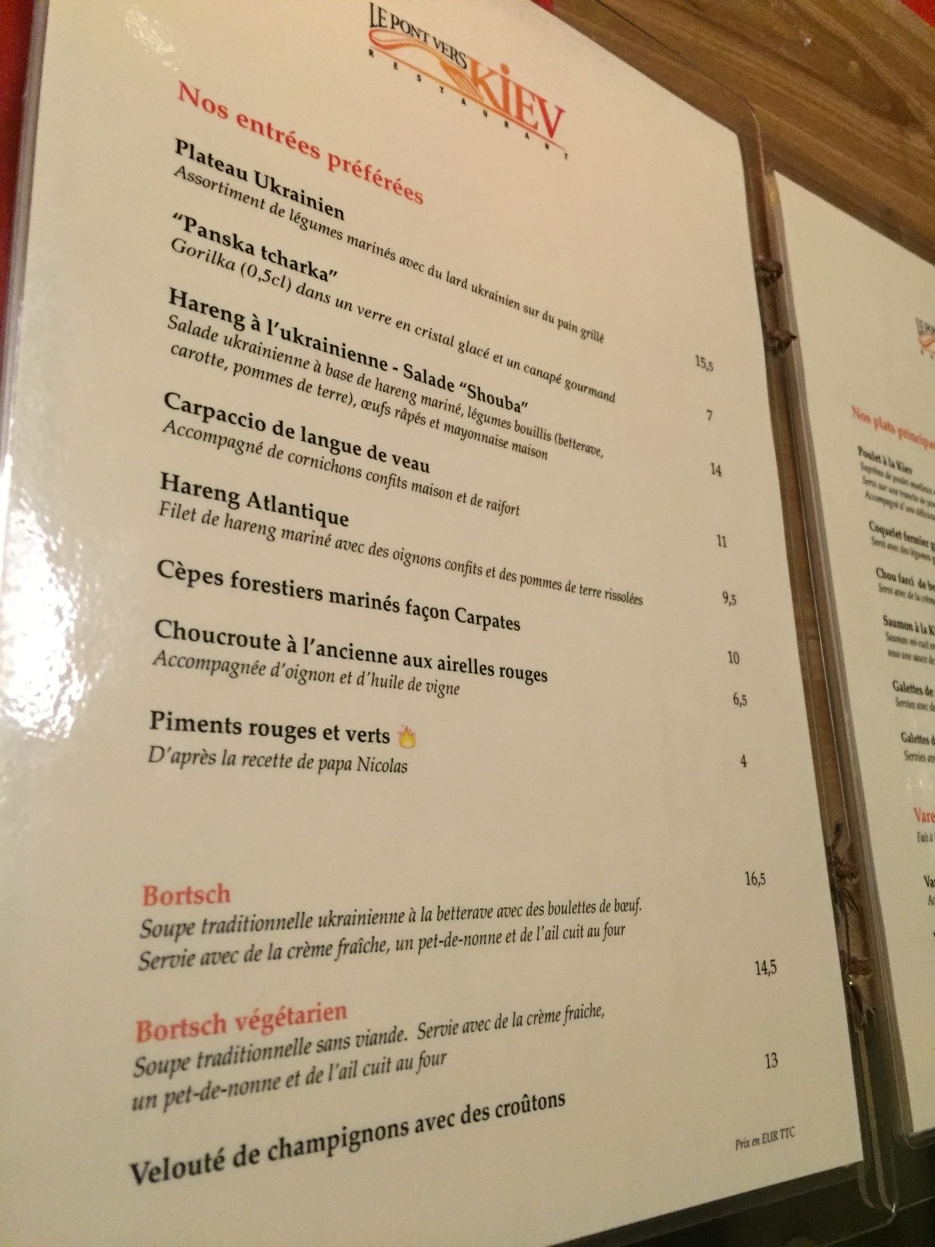 Toujours dans notre tour du monde de la gastronomie de Nice, nous avons mangé avec nos amis Antonio et Flo au Pont de Kiev, un restaurant Ukrainien. Nous n’allons pas le cacher, nous avons été très déçu par ce restaurant : Qualité médiocre, quantités insuffisantes, prix élevés, nous ne pensons pas y revenir. Une nourriture tout de même originale à découvrir.